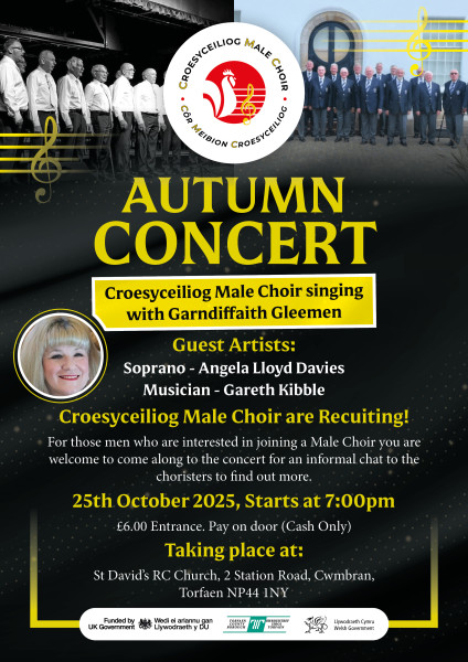 Croesycieliog Male Choir and Gardiffaith Gleeman Choir will perform together in a joint concert on the 25th of October. Please support this new alliance. We have a guest soprano , Angela Lloyd Davis, and our very own Gareth KIbble will play a music set., Come along and listen. We look forward to seeing you there. ‘This project is funded by the UK Government Shared Prosperity Fund’