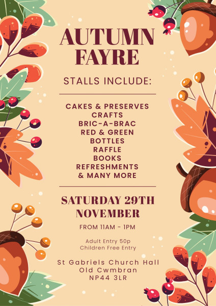 St Gabriel’s Church warmly welcomes everyone to join us for our Autumn Fayre on Saturday, 29th November, from 11:00 AM to 1:00 PM in the Church Hall, Old Cwmbran.