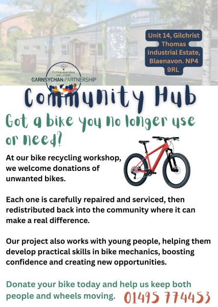 At our Community Hub in Blaenavon, we repair and refurbishment of donated bikes. Provide skills training and volunteering for young people. We redistribute affordable bikes to the community.