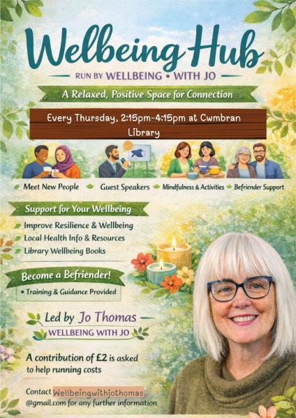 The Wellbeing Hub, run by Wellbeing with Jo, is a friendly, supportive weekly drop‑in held every Thursday from 2:15pm–4:15pm at Cwmbran Library. It offers a calm and welcoming space for people to connect, relax, and focus on their personal wellbeing.