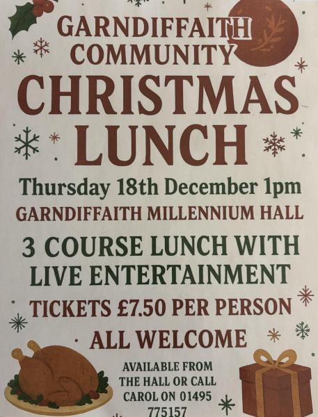 Join us for a festive afternoon filled with good food, great company and live music! Wednesday 18th December at 1pm Tickets £7.50 per person, includes 3 course delicious Christmas Lunch Enjoy the sounds of the Rhythm & Yukes Band! Spaces are limited so call Carol on 01495 775157 to book or pop in to the hall to collect