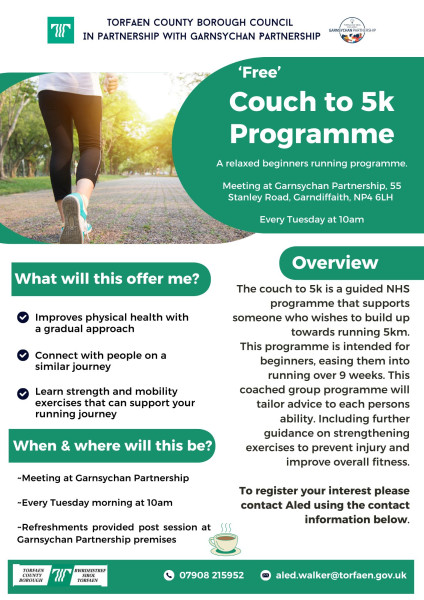 A free, join anytime, relaxed beginners running programme. Meeting at Garnsychan Partnership, 55 Stanley Road, Garndiffaith, NP4 6LH Every Tuesday at 10am The couch to 5k is a guided NHS programme that supports someone who wishes to build up towards running 5km. This programme is intended for beginners, easing them into running over 9 weeks. This coached group programme will tailor advice to each persons ability. Including further guidance on strengthening exercises to prevent injury and improve overall fitness.