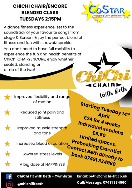 A dance fitness experience, set to the soundtrack of your favourite songs from stage and screen. Enjoy the perfect blend of fitness and fun with showbiz sparkle. You do not need to have full mobility to experience the fun and health benefits of ChiChi Chair/Encore, enjoy whether seated, standing or a mix of the two. Starting Tuesday 14th April. £24 for 4 weeks or individual sessions £6.50. Prebooking essential, contact Beth on 07491334960