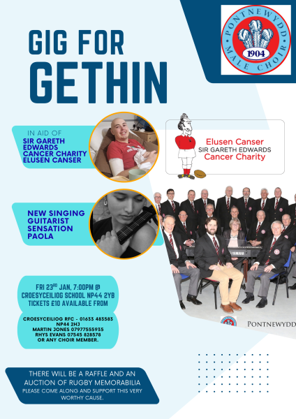 Gethin is a twenty year old undergoing cancer treatment and the choir wish to raise funds for his ongoing treatment. The event is supported by the Gareth Edwards cancer charity Elusen Canser. Do come along and help raise funds for this very worthy cause.