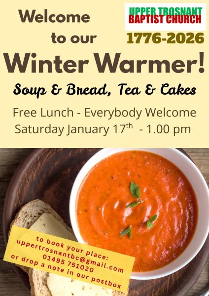 Everyone is welcome to join members and friends of Upper Trosnant for a friendly soup lunch, held in the Church Hall on Saturday 17 January. Please sign up to book your space by sending an email, leaving a phone message, or dropping a note in the church letter box on Lower Bridge Street.