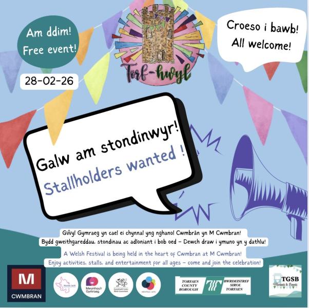 Mae Gŵyl Gymraeg Torfhwyl yn dod i ganol Cwmbrân ar 28ain o Chwefror 2026, ac rydym yn chwilio am stondinwyr i fod yn ran o’r digwyddiad. Digwyddiad am ddim, i bob oed, a chroeso i bawb.