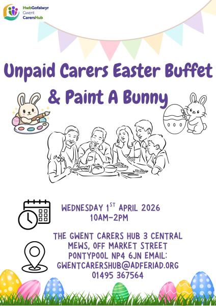 Join the Gwent Carers Hub for a fun and relaxing Easter‑themed event designed especially for unpaid carers. Enjoy a delicious buffet, connect with other carers, and take part in a creative Paint‑A‑Bunny activity. This is a great chance to unwind, socialise, and celebrate the season in a friendly, supportive environment. What’s Included -Easter‑themed buffet lunch -Creative bunny‑painting activity -A welcoming space to meet other unpaid carers -Light refreshments throughout the day