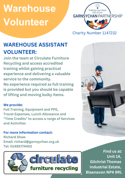 We are looking for someone to join our Circulate Furniture Recycling team as a volunteer warehouse assistant.