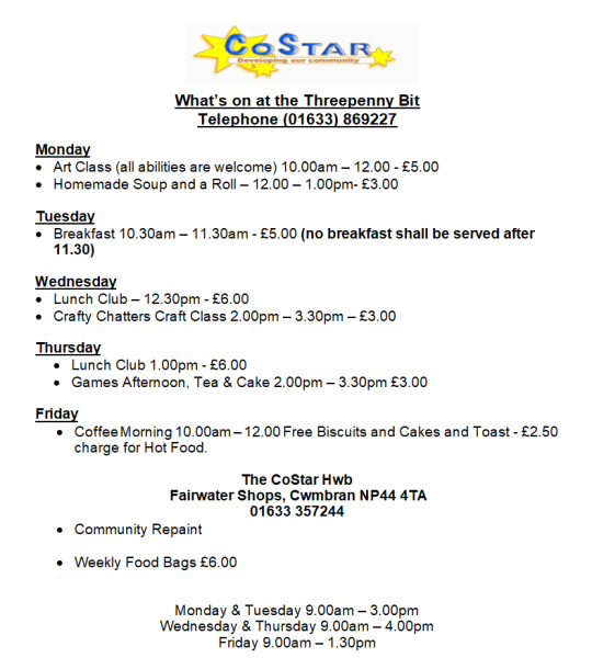 Weekly activities at the Threepenny Bit, Deerbrook, Greenmeadow Cwmbran including updated prices, prices and information on all activities including lunch and breakfast clubs plus art and crafts